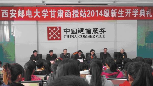 3月14日,西安邮电大学甘肃函授站2014级新生开学典礼在甘肃省邮电学校举行,我校副校长温小郑教授,继续教育学院院长薛蓉娜、书记曹利戈,甘肃省科技培训公司副总经理、甘肃省邮电学校副校长王万勇、甘肃省邮电学校书记蒋宜兴、副校长沈祯林及甘肃函授站2014级全体新生出席典礼,典礼由继续教育学院副院长郭琪主持。